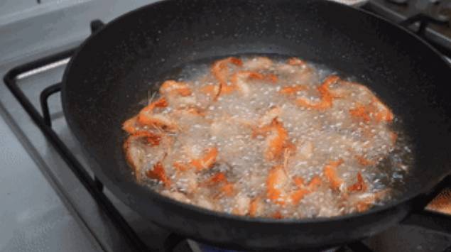 2、砂锅下食用油,旺火烧至220度时(冒烟),将虾下锅,用手勺不断推动,约炸30秒钟,用漏勺捞起