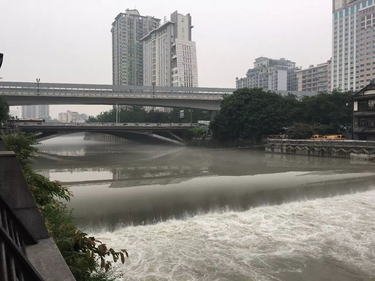 说到翻水埂子,上了一定年纪的成都人都知道,它在南门大河还形成了一道非常独特的景观。河水从桥洞出来冲下斜坡稍事减缓后,便会遇到这样一条钢筋混凝土埂子的拦阻。这条埂子横截面为矩形,高约20来公分,宽约三、四十公分,从南到北蹲踞于河底,形成一道像门槛一样的拦水堤,其作用可能是为了减小急流对下游河床的冲刷吧。流经一、二洞的水小,遇到水堤后仅轻洒水珠,缓缓翻过。而三、四、五、六、七洞,尤其三、四、五这几个中洞的水很大,碰到拦截则会毫不犹豫地飞溅浪花,呈半圆弧状越堤而过,并发出愤愤之声以示抗议。试想一下,几十米宽的半圆弧水流经年不息地横亘河道,到了夏季涨水的时候,犹如万马千军,奔腾汹涌,咆哮怒吼之声震天动地,河岸上都能领受到扑面的水雾,那是一个怎样的情状啊!虽然与黄河壶口瀑布、现在小浪底调水冲沙的惊心动魄比起来,其阵仗差之甚远,但在上世纪五、六十年代的成都人眼里,却的确是一幅颇为壮观的好画图。