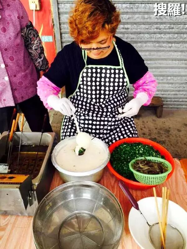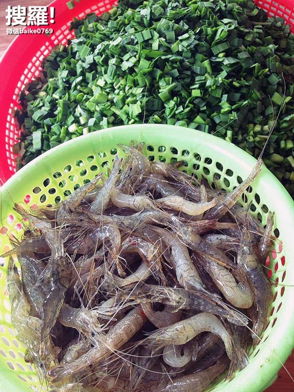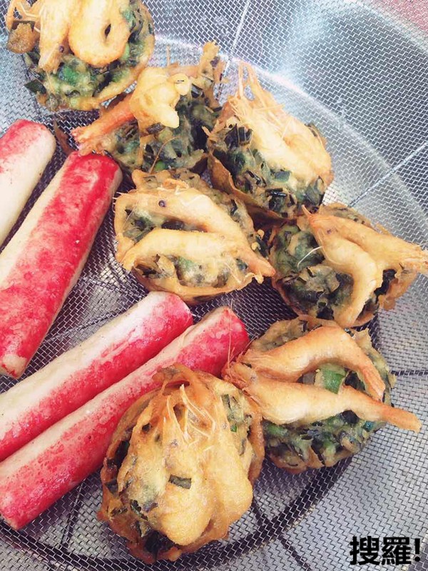 韭菜垫底,放河虾,裹浆,即点即炸即食