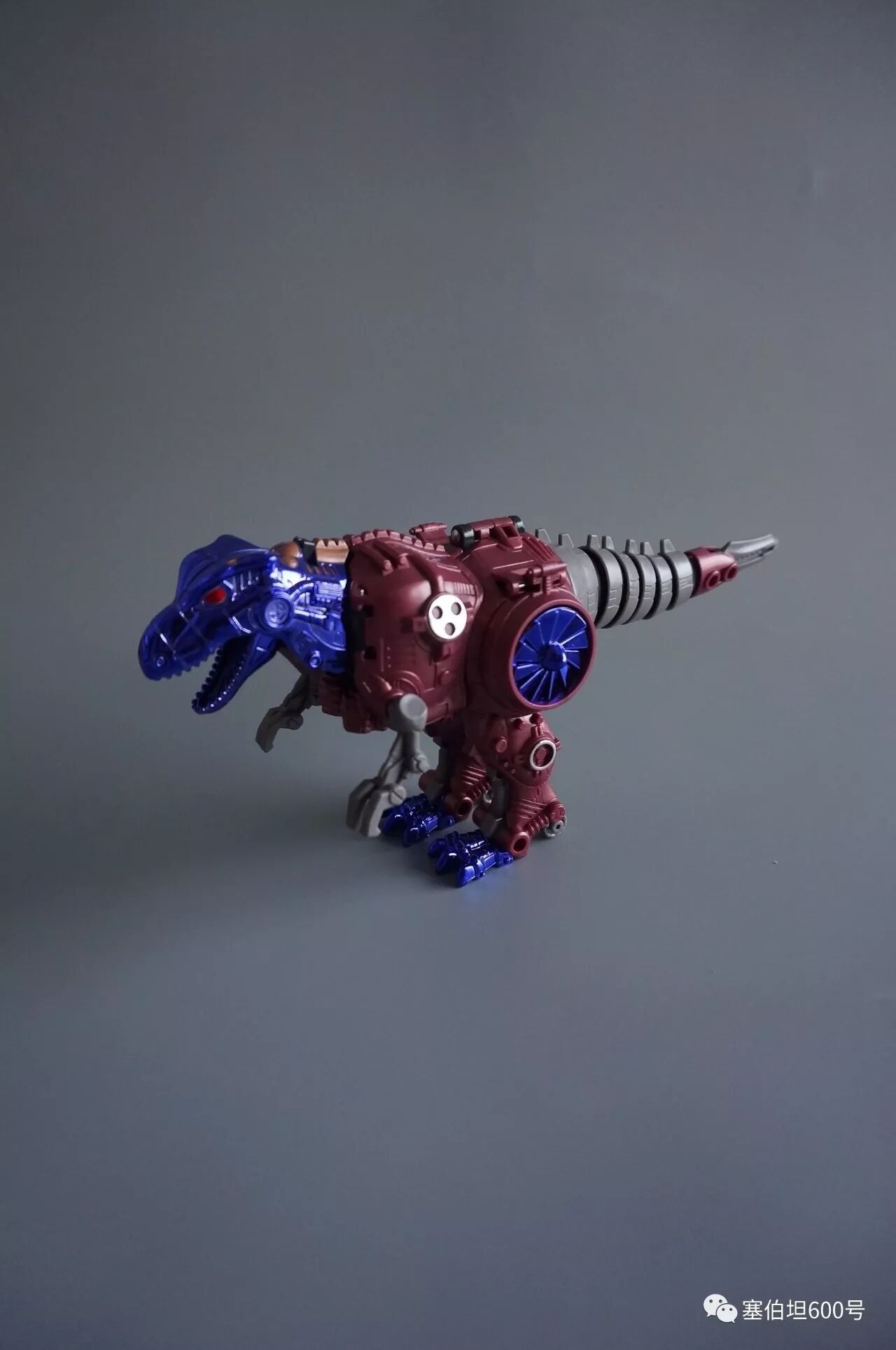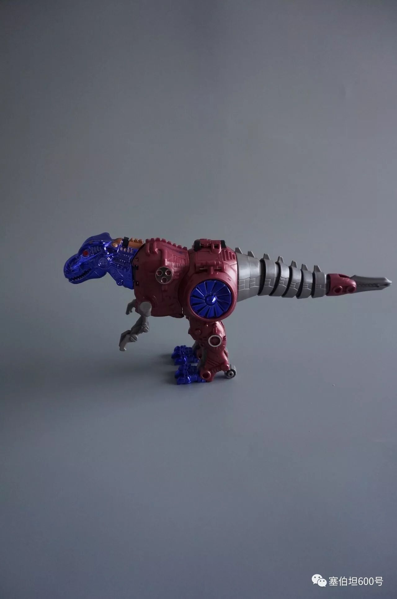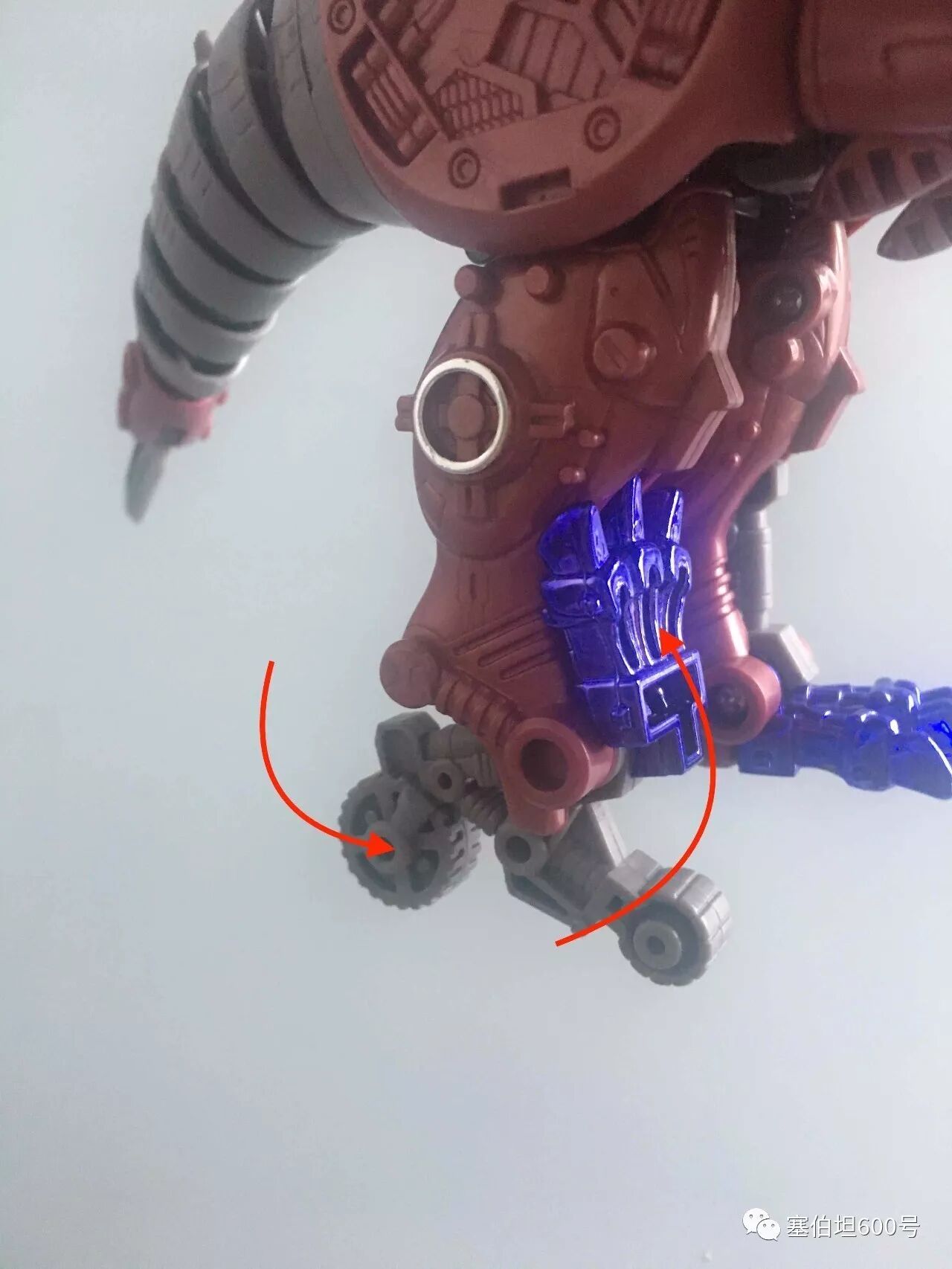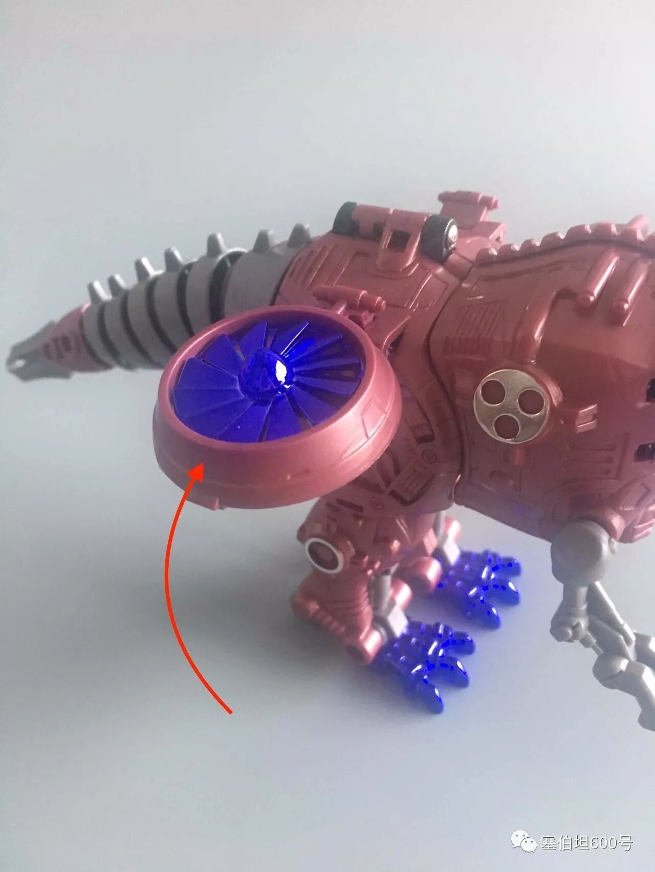 和其他金属变体玩具类似,这款霸王龙也有一个由野兽形态转变过来的交通工具形态。首先看到龙形大腿侧面的涡轮。这个涡轮用了蓝色电镀,非常好看,而且里面的电镀件可以转动。