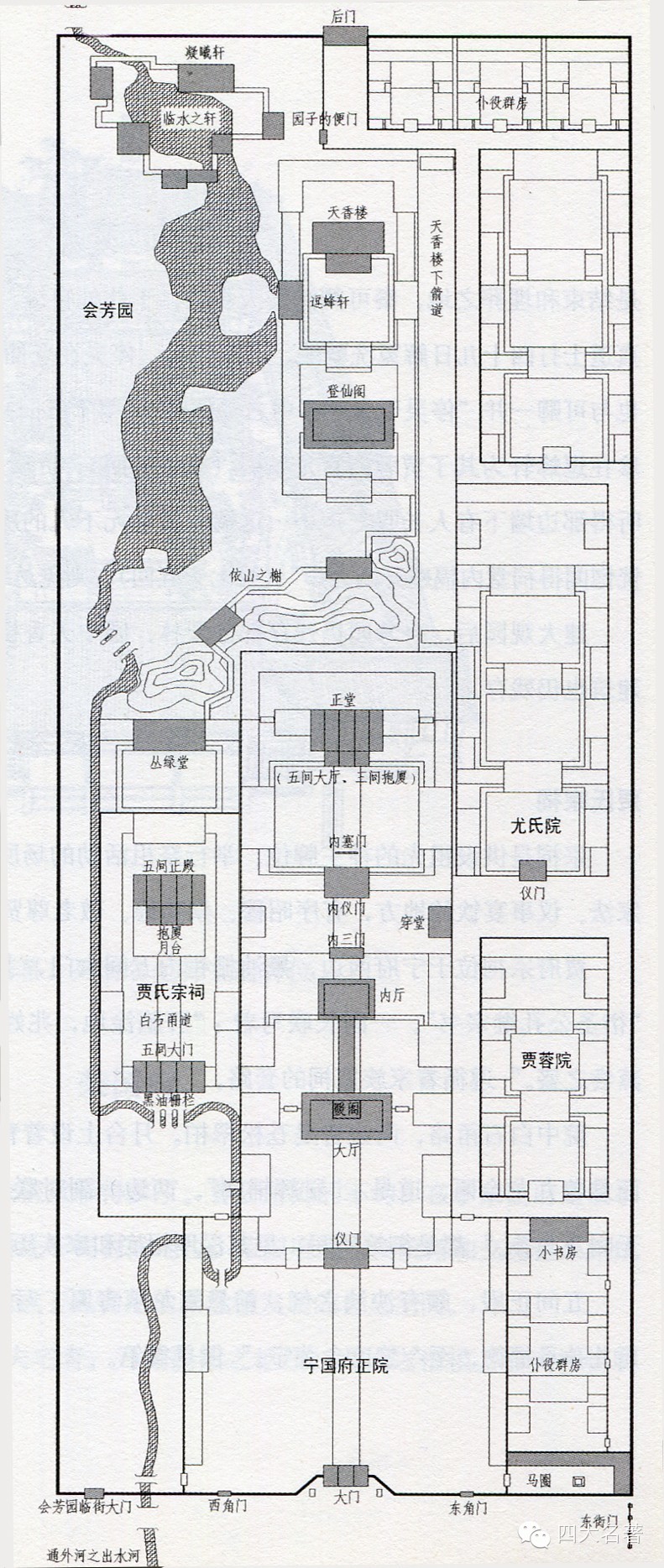 仔细辨析,宁府的府邸应集中在东路和中路,书中着重提出有“三间一所抱厦”,应是正堂前的抱厦。书中有这样一句话:“宁国府从大门、仪门、大厅、暖阁、内厅、内三门、内仪门并内塞门,直到正堂,一路正门大开”,曹公在这里着意渲染了宁国府的广宇重门,庭院深邃,但实际上建筑布局不会这样从南到北彼此紧挨着布置下来,它应该是表现了一个三进院落:第一进院落是从“大门”到“仪门”;第二进从“仪门”到“内三门”,这一进院落中有大厅及左右暖阁和后面的内厅;第三进院落就是从“内三门”到“正堂”,其中“内三门”应是“内仪门并内塞门”的组合,“内塞门”可以理解为“内仪门”即垂花门的一道屏门,这是符合当时建筑的通常做法的。这一路的各层门,就构成宁国府的中轴线。