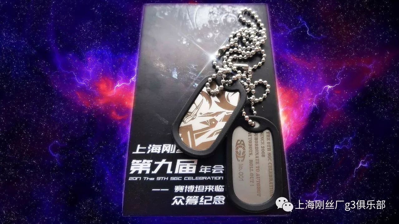 狗牌由合金材料制成,刻有年会信息(正面英文,背面赛星文),抽奖号码外。副牌也是大有讲究,单号套牌为狂派刻纹,刻有威震天头像,及 All hail Megatron【威震天万岁】这句狂派口号。而双号则是博派,刻有擎天柱头像,以及经典的Autobots,ROLL OUT【汽车人出发】这段经典台词。而且无论单双号牌均刻有塞伯坦古文字中象征勇士的符文。