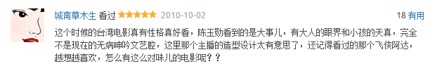 “这个时候的台湾电影真有性格真好看,陈玉勋看到的是大事儿,有大人的眼界和小孩的天真,完全不是现在的无病呻吟文艺腔,这里那个主播的造型设计太有意思了,还记得看过的那个飞侠阿达,越想越喜欢,怎么有这么对味儿的电影呢??”
