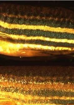 科学研究用斑马鱼实验的对比效果,图上部为光线照射下斑马鱼的体表色素;图下部为遮光下斑马鱼的体表色素。