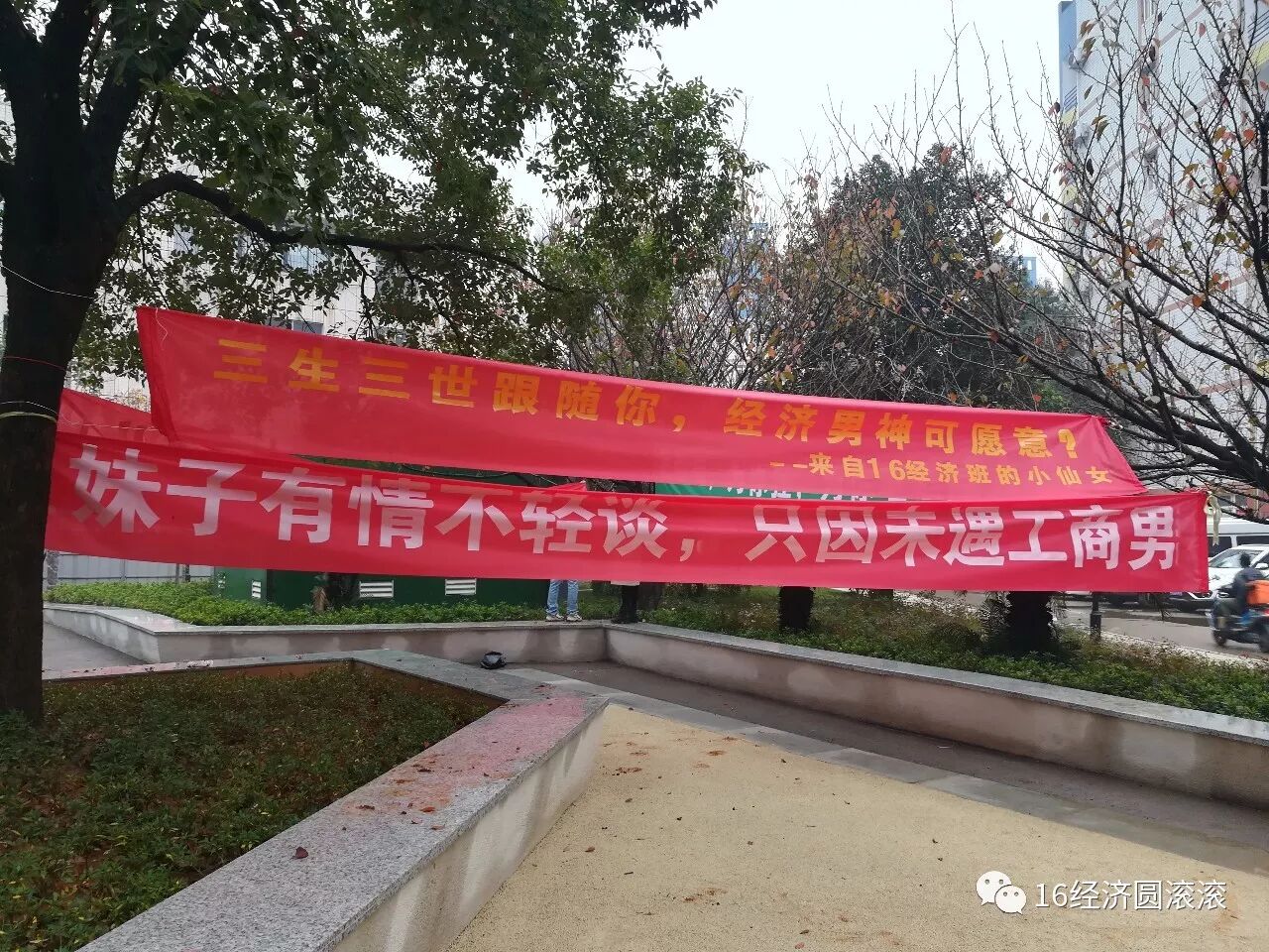 天马学生公寓道路两旁醒目的“三生三世跟随你,经济男神可愿意”表白标语,表达了同学之间的浓厚情谊,提高了班级团结向上的氛围。