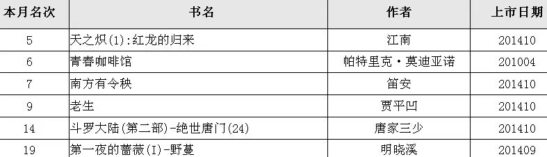 本月首次上榜图书数量众多,并且畅销势头强劲,共有6种首次上榜图书,其中4种均进入了榜单前10名。本月首次上榜图书除今年诺贝尔文学奖得主帕特里克·莫迪亚诺的《青春咖啡馆》以外,其他均为今年9月或10月上市的新书,这些新书既有江南、笛安、明晓溪等流行文学作家的新书,也有贾平凹这样的文学大家的新作。与首次上榜图书相比,本月返榜图书仅有1种,为排在第27名的《红岩》。