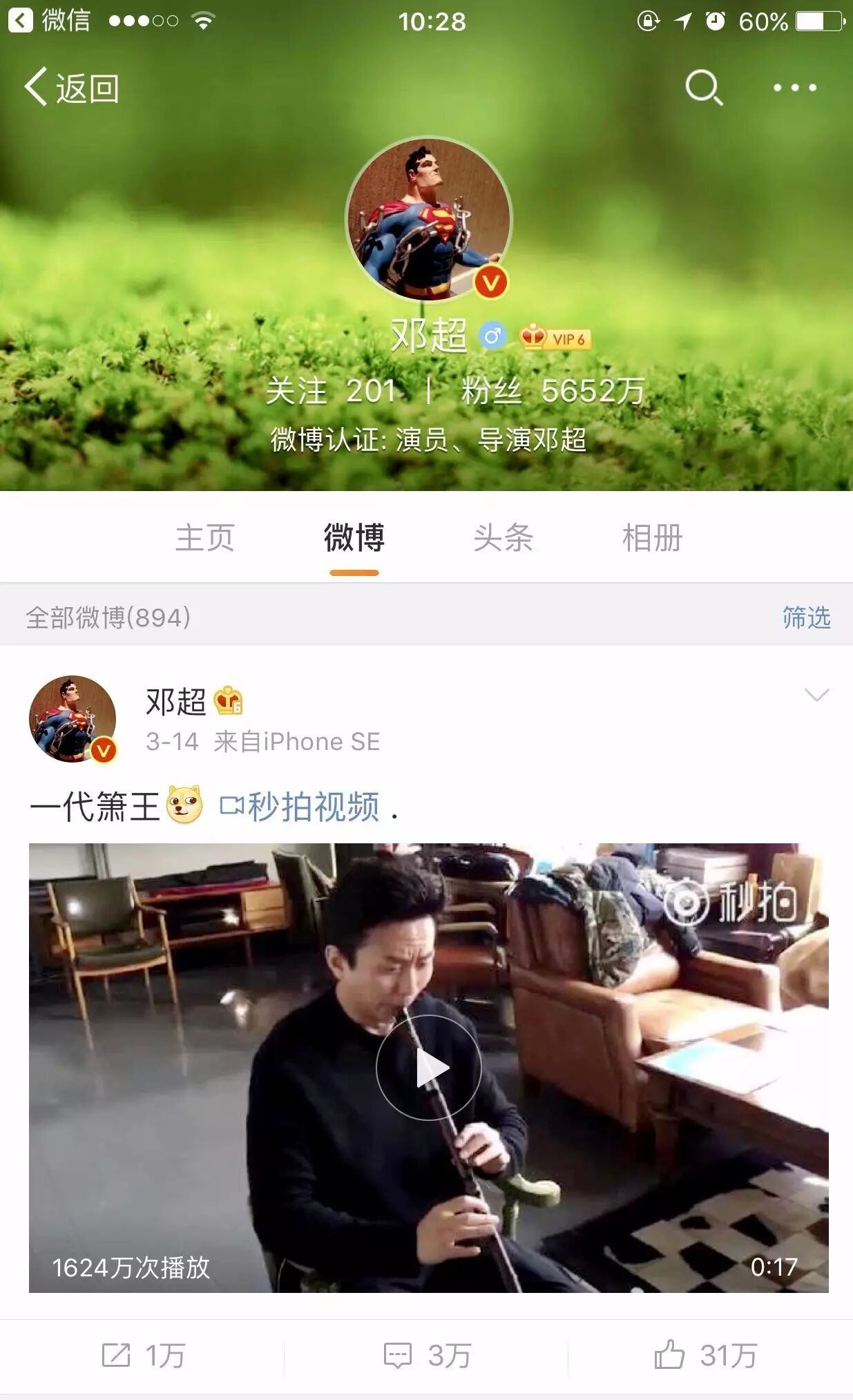 邓超最近也开始“苦练”洞箫了,2天时间这段视频就在这里播放了1600多万次了。也难怪,5千多万的粉丝基数摆在那里,让更多人能够知道洞箫是个什么东东。