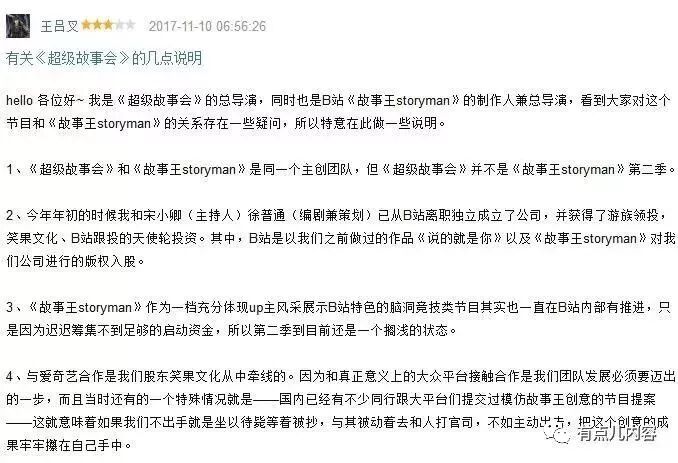 剩下的中小型创业公司则努力寻求资本与平台支持。例如《故事王》的主创团队离开B站创业,在获得游族领投,笑果文化、B站跟投的天使轮投资后,通过笑果文化牵线,与爱奇艺合作在今年11推出了泛二次元脱口秀网综节目《超级故事会》。