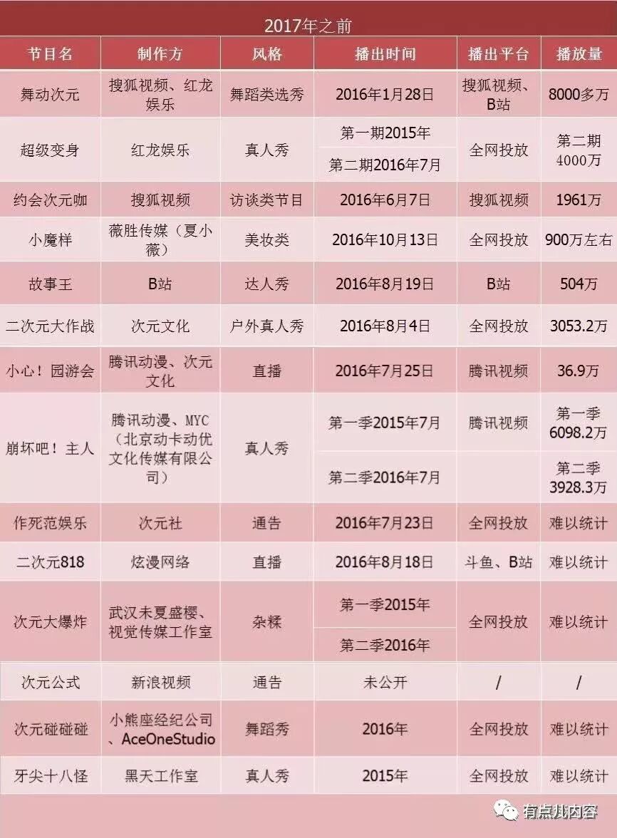 早期,原本由诸如红龙娱乐、黑天工作室、次元文化等中小型创业公司主导的自制二次元综艺,主要是将二次元文化和网综相结合。根据公开消息不完全统计,在2017年之前至少有14档二次元网综上线。