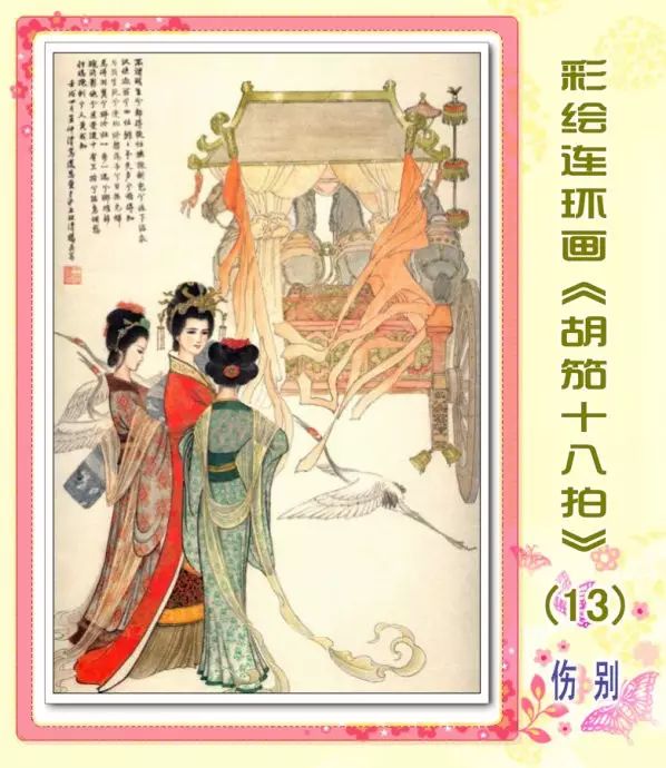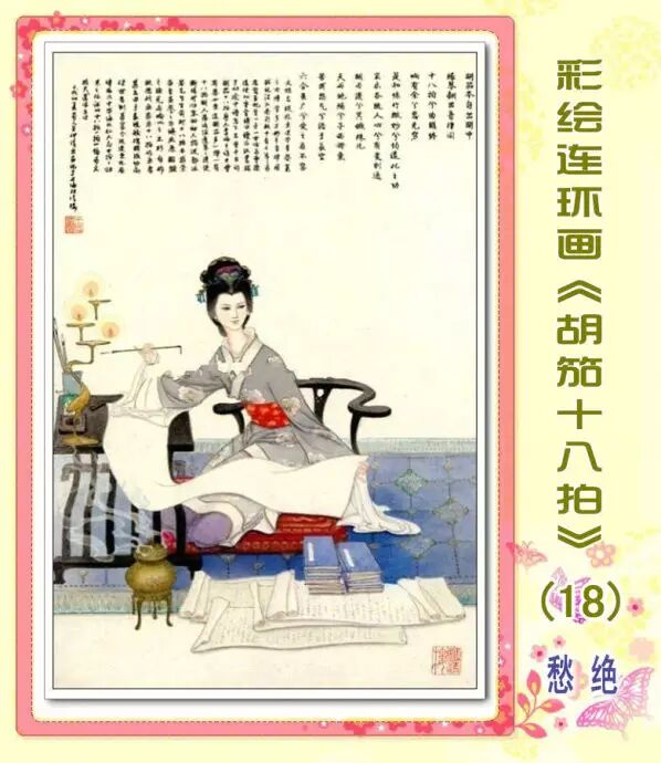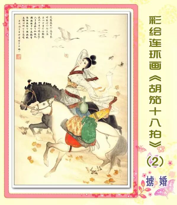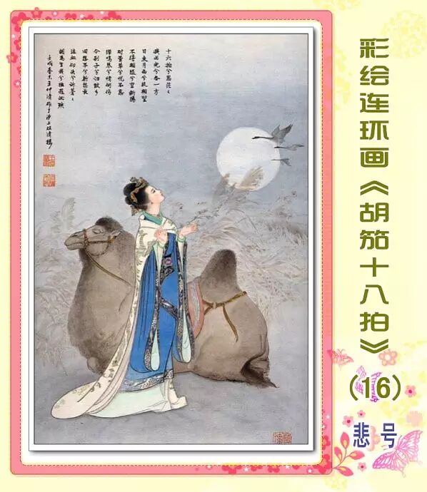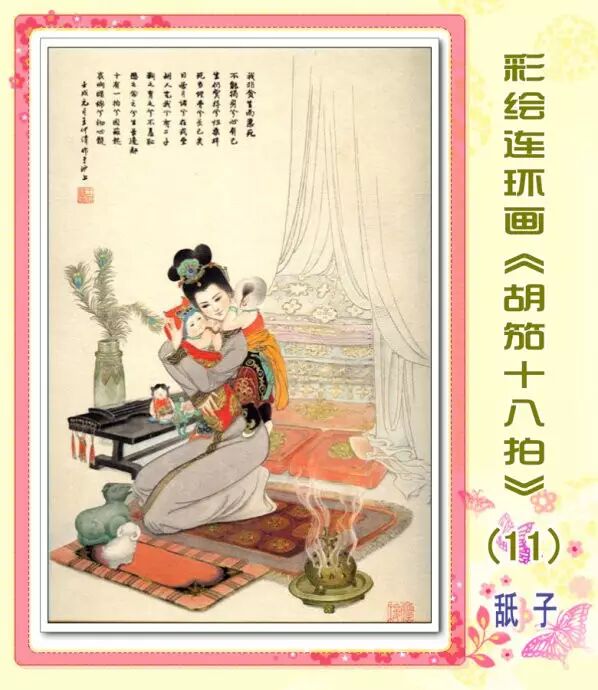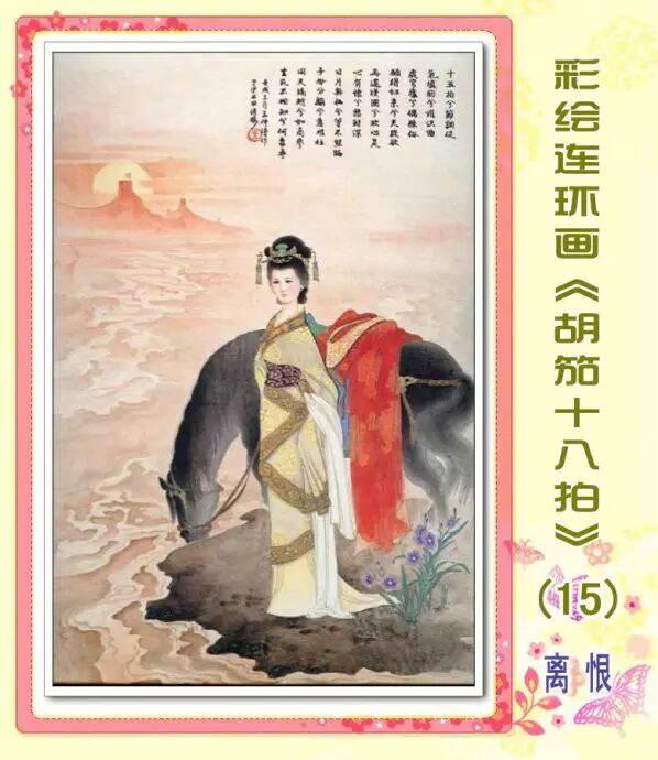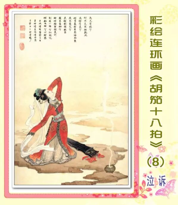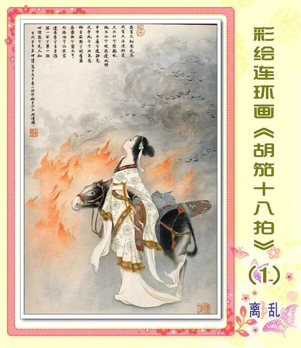 《胡笳十八拍》这篇长诗共十八壮,每章为一拍,分三大段。第一段写蔡琰被胡骑挟持,远离家乡,一路上受尽凌辱而感绝望。第二段写蔡琰怀着无限的忧愤在胡地苦捱日子,后与胡人生了孩子,辛勤养育之余,希望有朝一日能重返故乡。第三段写盼来了故乡的使者,却要与稚子永远分离,去留之际,蔡琰心情复杂而矛盾。踏上归途后,思子之情更是日盛一日,曲终辞罢,哀愁之思犹如琴音的余响难以平息。