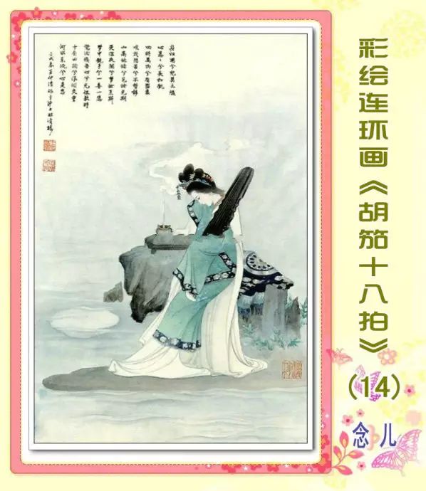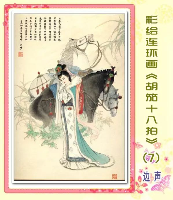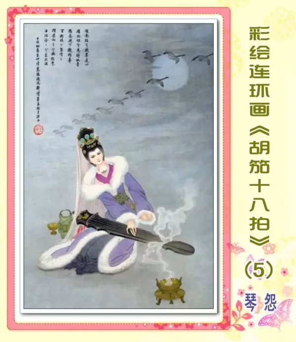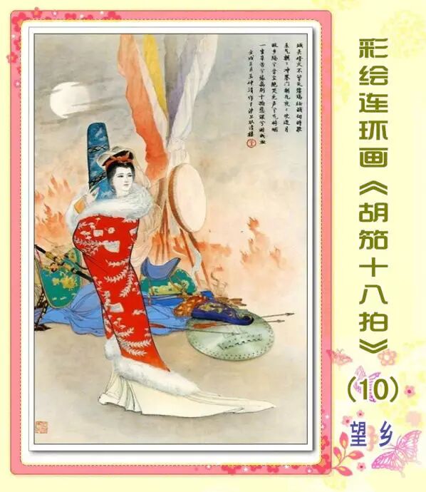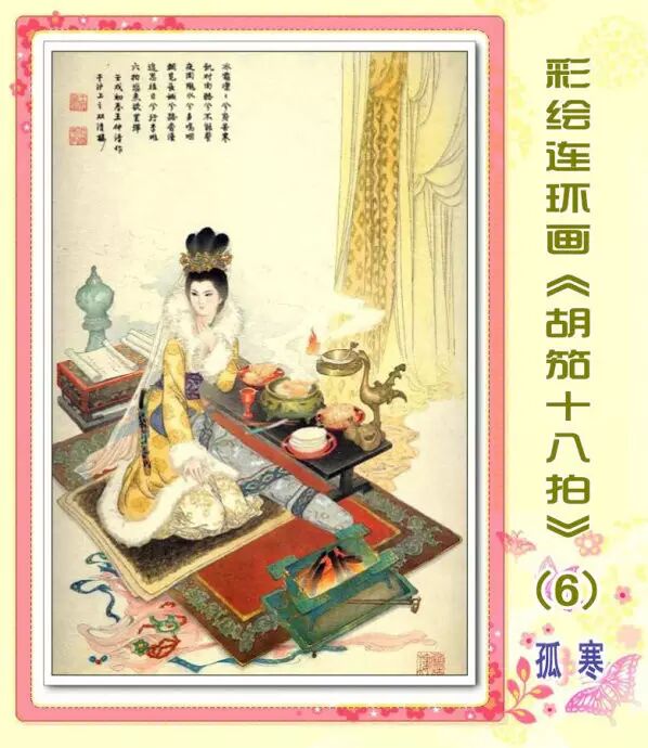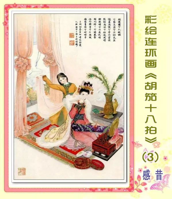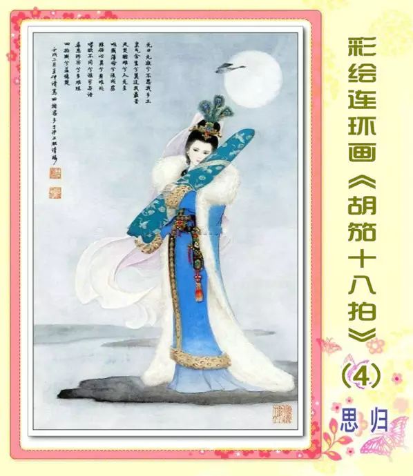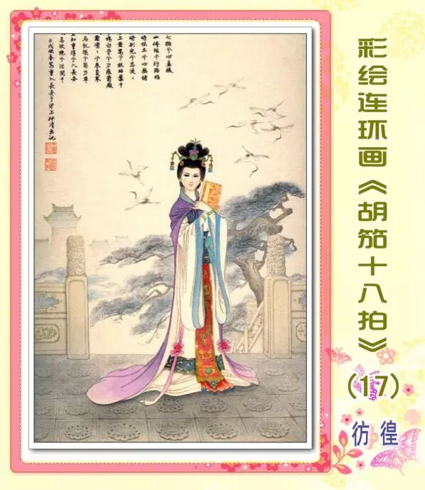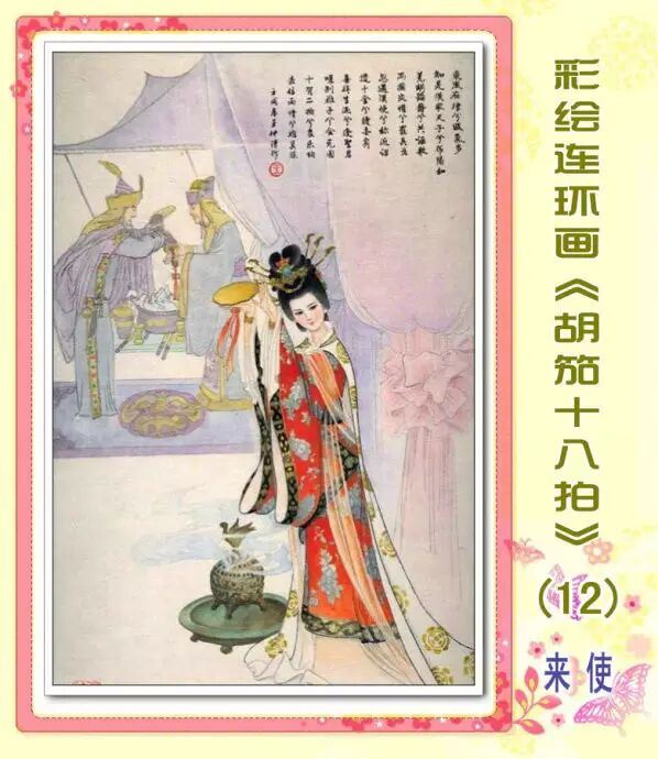 《胡笳十八拍》这篇长诗共十八壮,每章为一拍,分三大段。第一段写蔡琰被胡骑挟持,远离家乡,一路上受尽凌辱而感绝望。第二段写蔡琰怀着无限的忧愤在胡地苦捱日子,后与胡人生了孩子,辛勤养育之余,希望有朝一日能重返故乡。第三段写盼来了故乡的使者,却要与稚子永远分离,去留之际,蔡琰心情复杂而矛盾。踏上归途后,思子之情更是日盛一日,曲终辞罢,哀愁之思犹如琴音的余响难以平息。