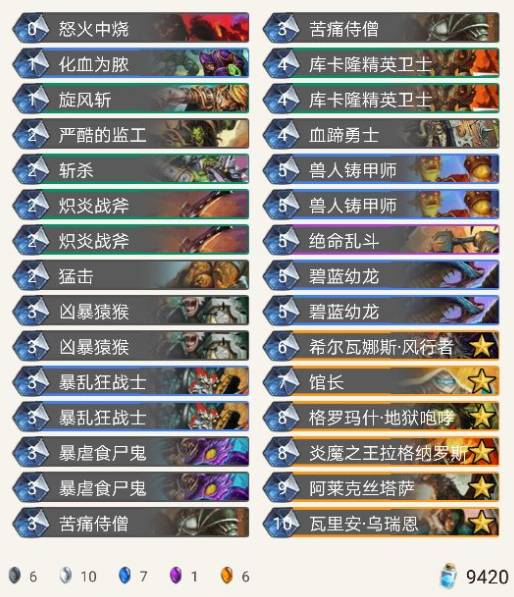 瓦王:我们的核心牌之一。劝退手段之一。翻盘手段之一,劣势的时候,关键回合可以赌一手拉出吼爹。印象深刻的有一把我打青玉德对面11 12的青玉都出来了。我瓦王拉出库卡隆吼爹给了个怒火中烧。直接翻盘。所以后来我有时候大劣势手上有怒火中烧也敢赌一手瓦王拉嘲讽和拉冲锋。