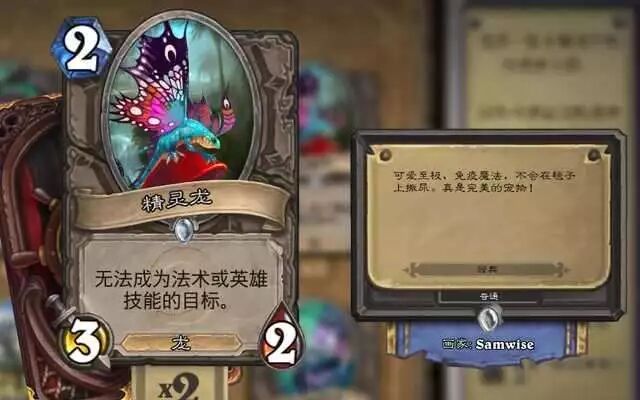 精灵龙在经典版时是人人都会带的2费随从,现在天梯中很少有人使用,原因是2王子不给其他2费机会。控制卡组又不需要太多2费。但在竞技场中却是一个宝贝,本身2费3/2身材外加魔免又是一个龙属性,被公认为炉石竞技场2费最强。