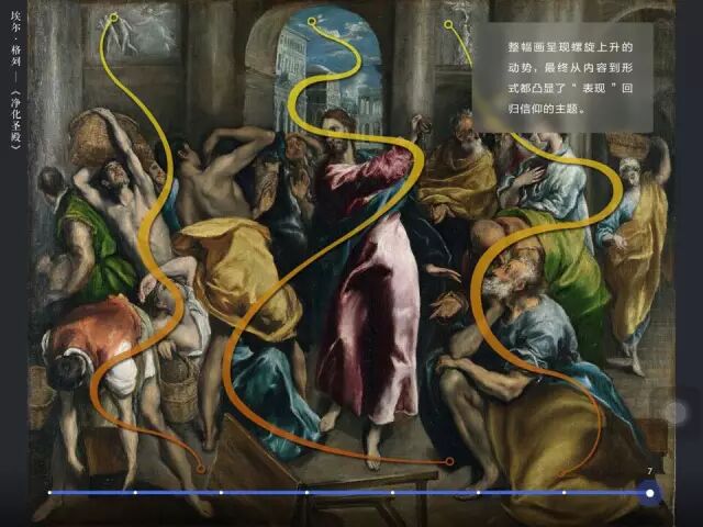埃尔·格列柯的《净化圣殿》中,画面动感十足,画面中心的和人物的动势线呈螺旋上升的态势,满足了绘画最终要飞升天堂的需求。