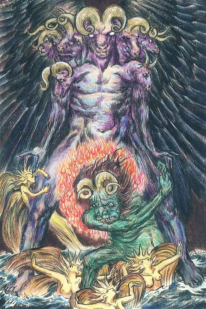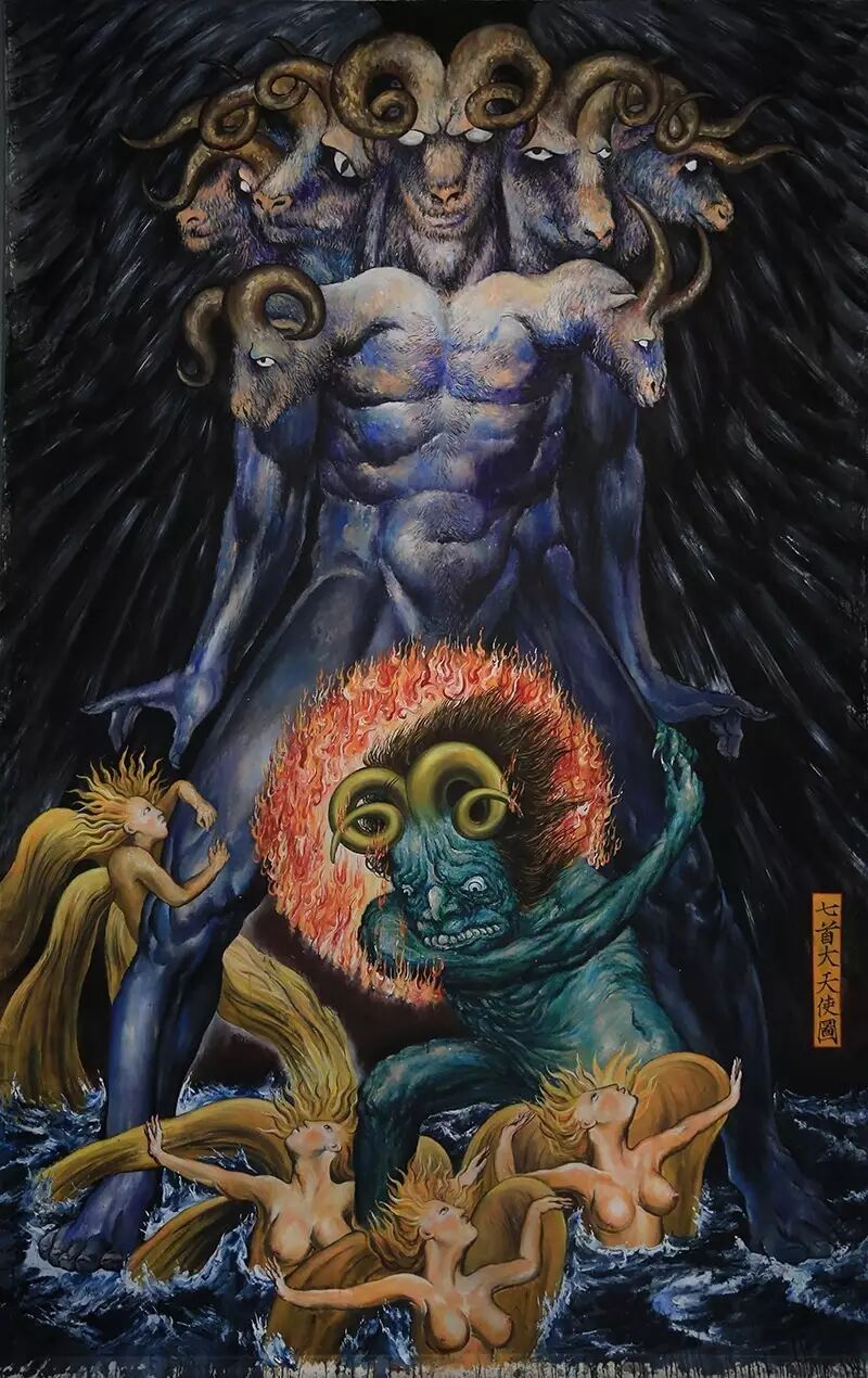 对羊的这种双向理解产生了作品中“七首羊”的主体。七首羊的形象来源于《·启示录》中末日审判时天空出现的大红龙,他拥有七个头,是撒旦的化身。而在18世纪英国诗人威廉·布莱克所做的大红龙组画中,大红龙的形象更是直接与羊产生了联系,作品中的主体形象源自于此。但是作品中也并没有把“七首羊”作为魔鬼的形象出现,而是让他拥有了天使的翅膀,并且让环抱在他周围的四大天使(米迦勒、加百列、拉斐尔、乌列,作品中以女性形象出现,因为在记载中天使并没有明确的性别指向)做了提示。