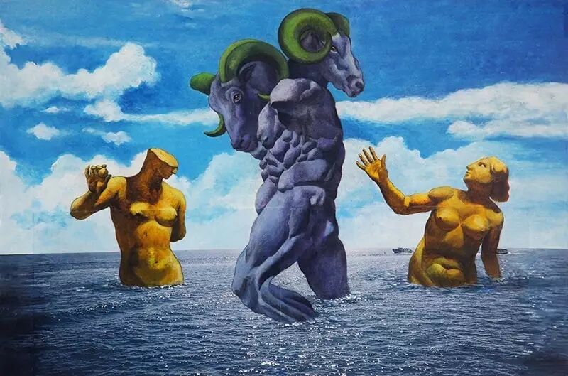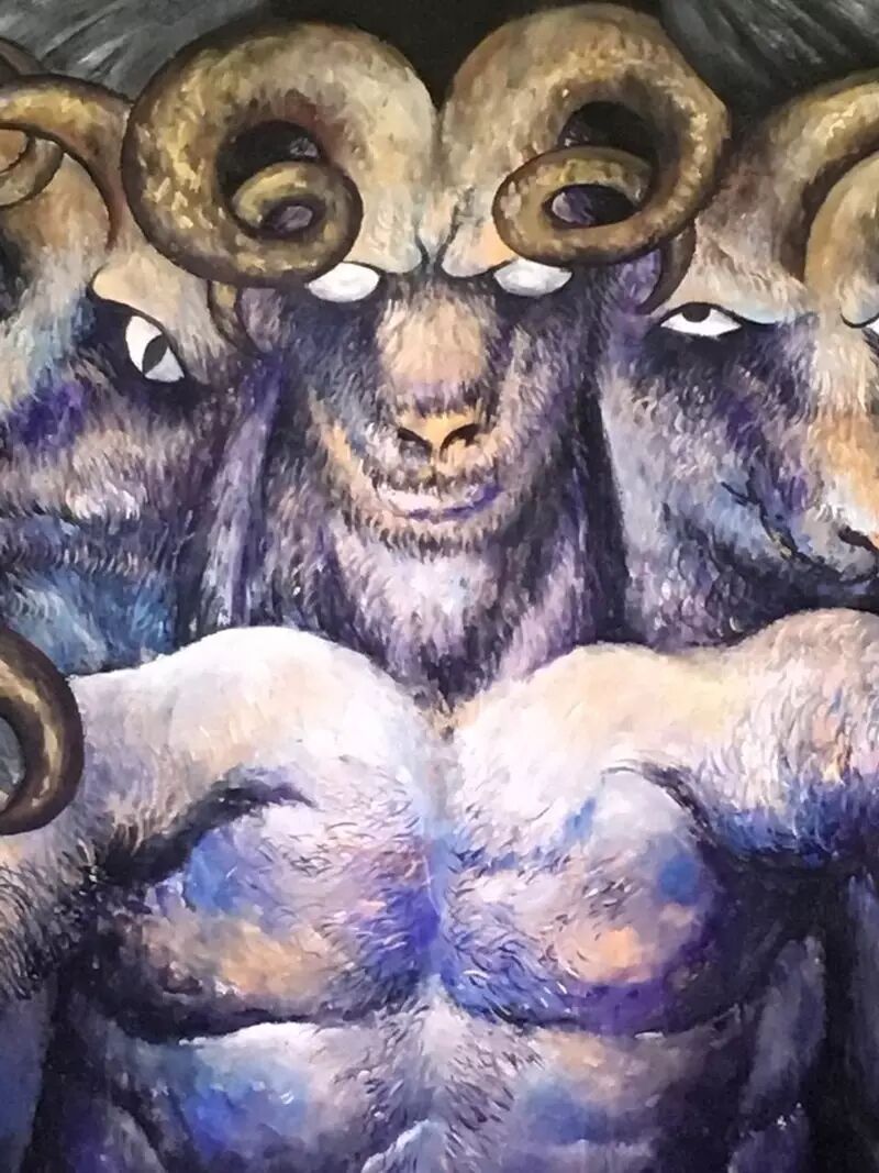 作品表达的初衷来自于羊年新年来自于英国的一篇有趣报道:中国的羊年究竟指的是山羊还是绵羊。这里牵扯出一个常识性的模糊认知,山羊和绵羊是与人类最为亲近的两种羊,但是山羊在希伯来文明里所承担的角色向来是反面的,即有魔鬼的含义。在希腊文明里最具代表的山羊形象便是潘神,但是神话对于潘神的叙述也是先从反面开始的,描述他如何的丑陋,如何的自卑等等,然后以他的勇敢来反衬出神的精神。