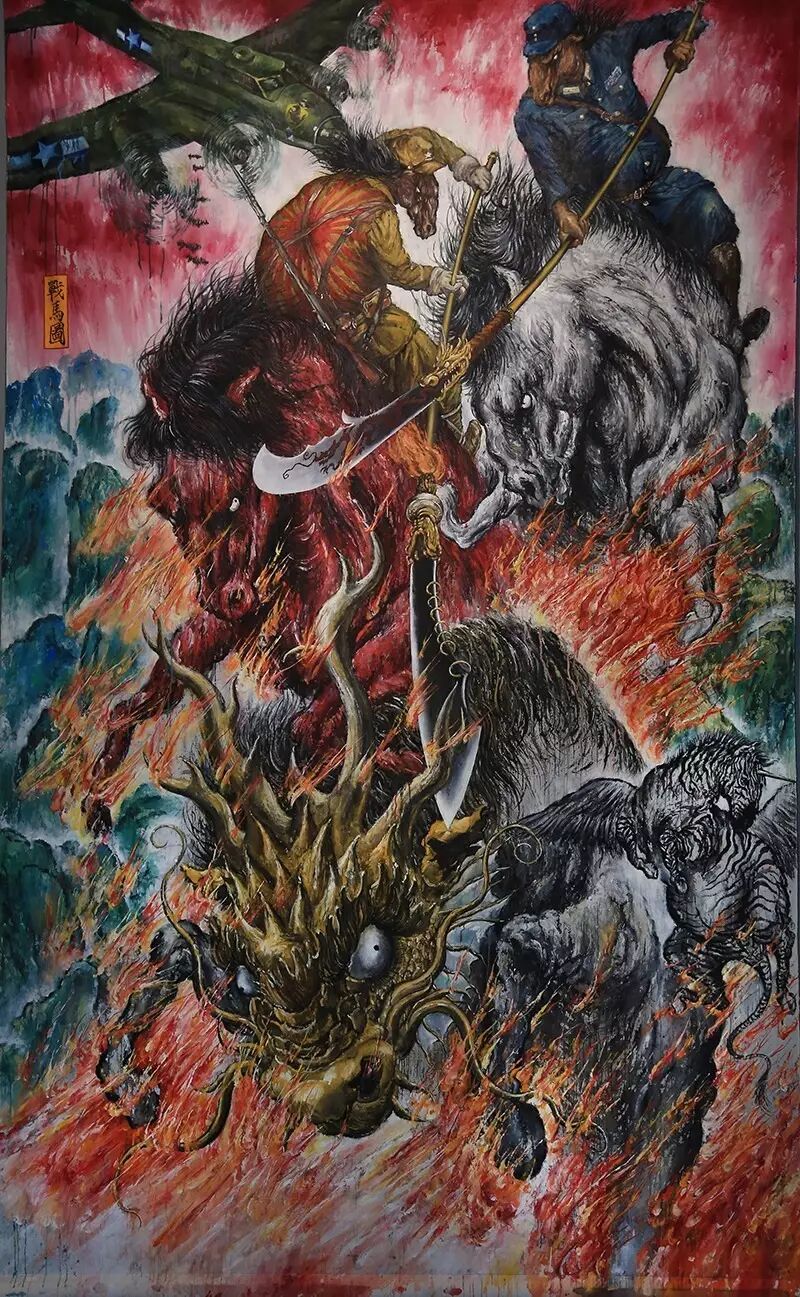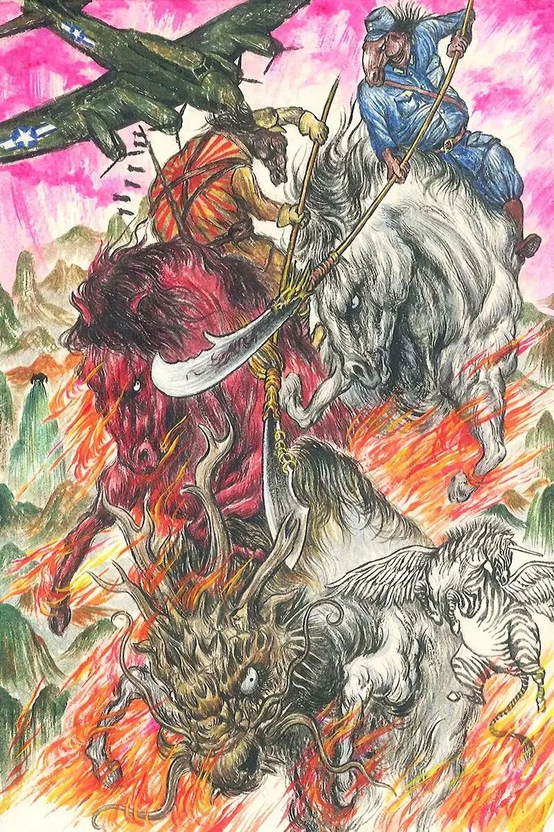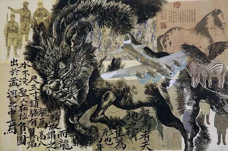 作品底下出现的是中国古代传说中的龙马,龙与马交合的产物,《五杂俎》记载:龙性最淫,故与豕交,则生象;与马交,则生龙马。画面上方的飞机是美军二战时期的轰炸机,暗示了整个画面叙事的时间线。