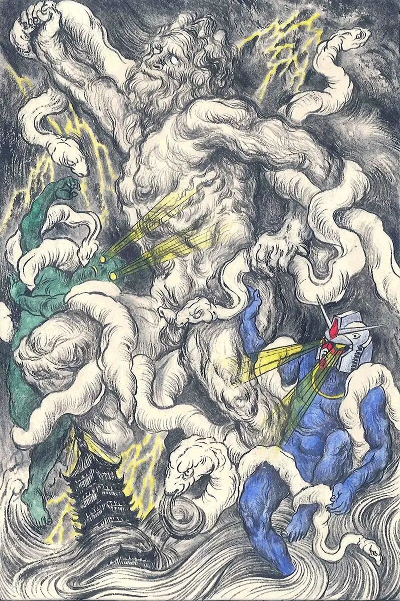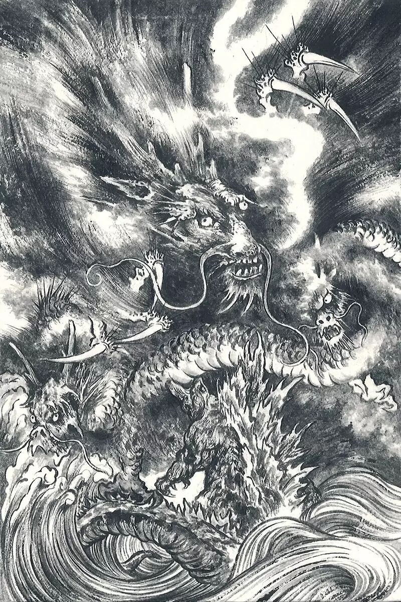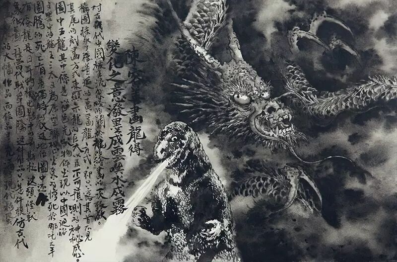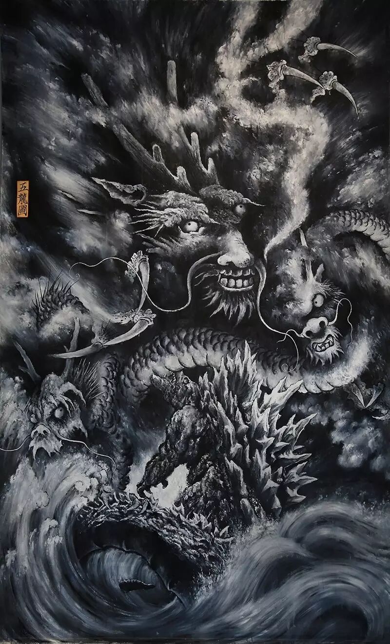 图中有五条龙,其中一条是以白色光状物体出现,回应了古时人们对大自然中出现异常景象的奇幻想象。而图中的还有一条“龙”则是我们熟悉的哥斯拉。哥斯拉的形象显然是根据西方世界的龙的形象加之日本20世纪电影工业技术的特点以及霸王龙的形象综合设计出来的,哥斯拉后来也慢慢演变为一种当代反战的象征。