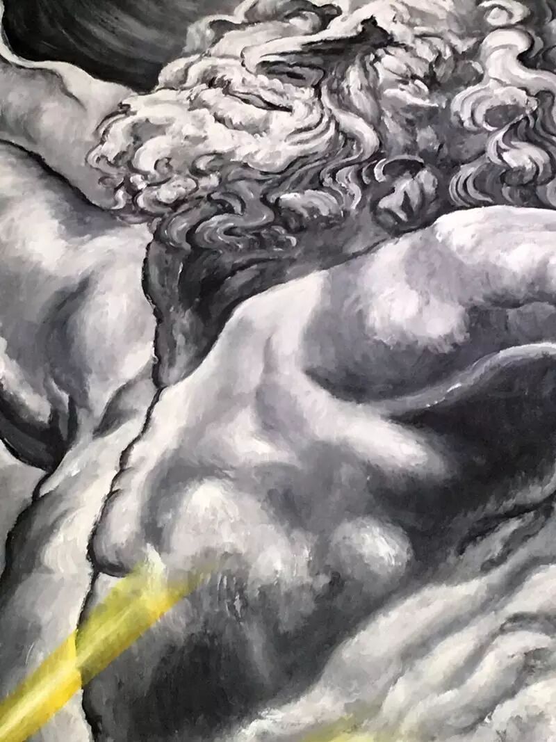 所以这件作品里所说的恰是这两个故事的一个混合后的产物,拉奥孔被巨蛇缠绕,同时底下浪涛涌动湮没了金山寺。而作品本身也想让人对蛇有图腾之外的另一层观感,即是一种文化象征。