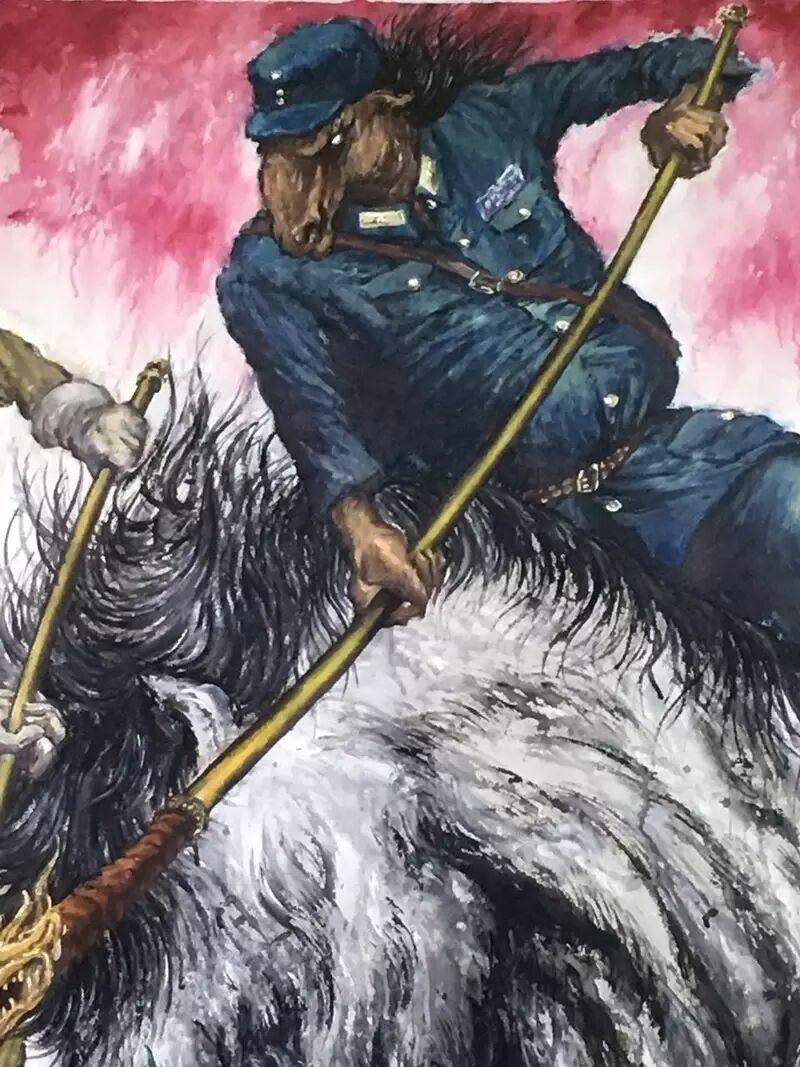 这件作品灵感来自于《战马》这部电影。马被人类饲养的历史基本上可以说是人类的一部战争史,而人类的战争史基本上也可以算人类的进步史。所以作品中描绘的是一个类似于抗日战争的背景画面,但主人公全都成为了马,没有人。