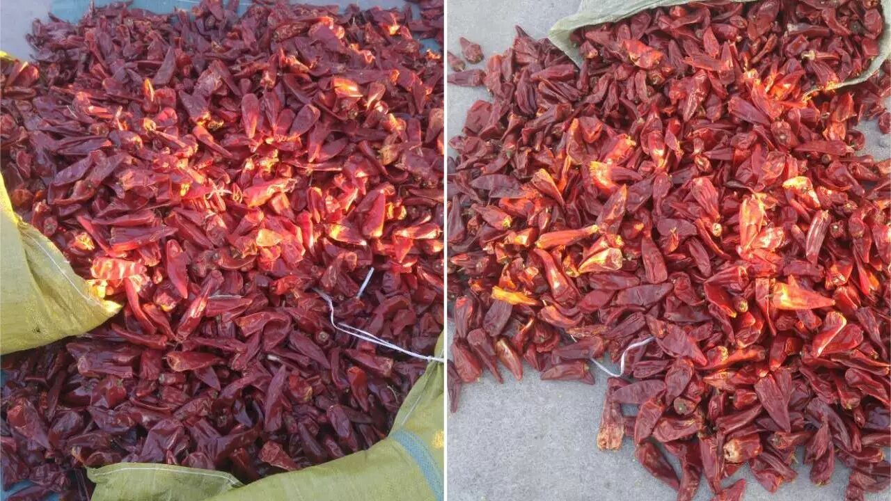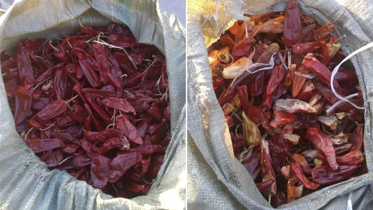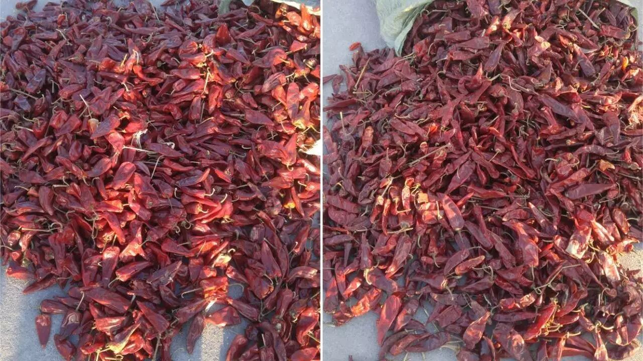 图三:新疆甜椒花皮,颜色相对较浅,估计约9成干左右,报价5500-5600左右,如上图左,