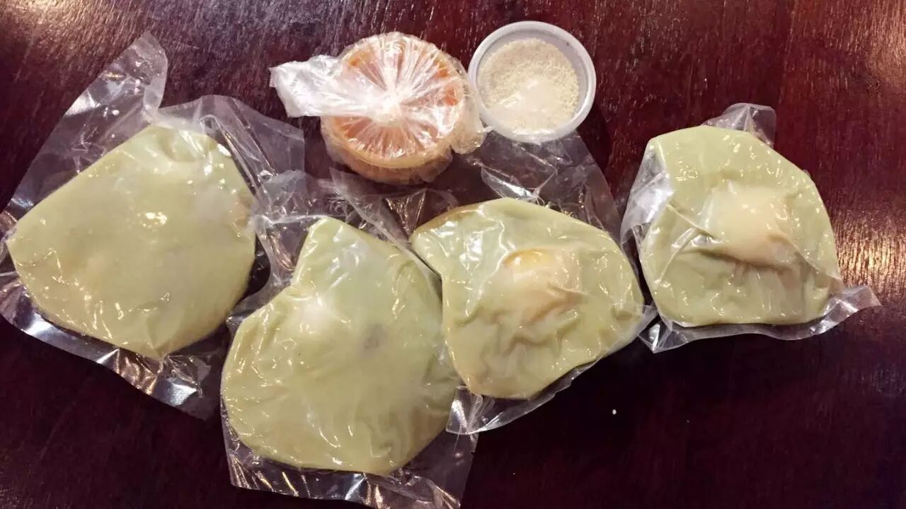 好友跟我说,鲎粿被真空包装,用冰块保鲜,辣椒与芝麻一应俱全,通通被置于泡沫箱中,刚拆出来还是凉呼呼的。