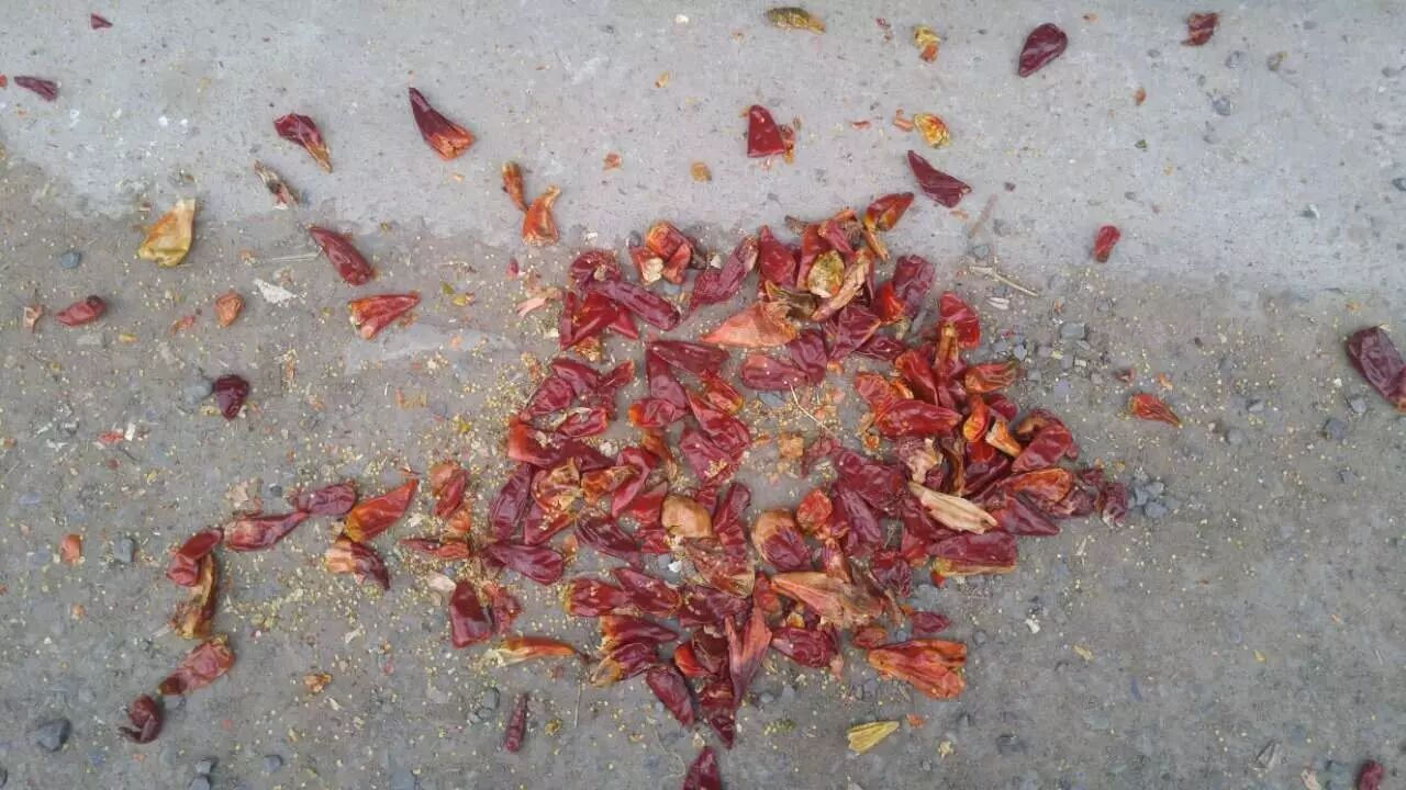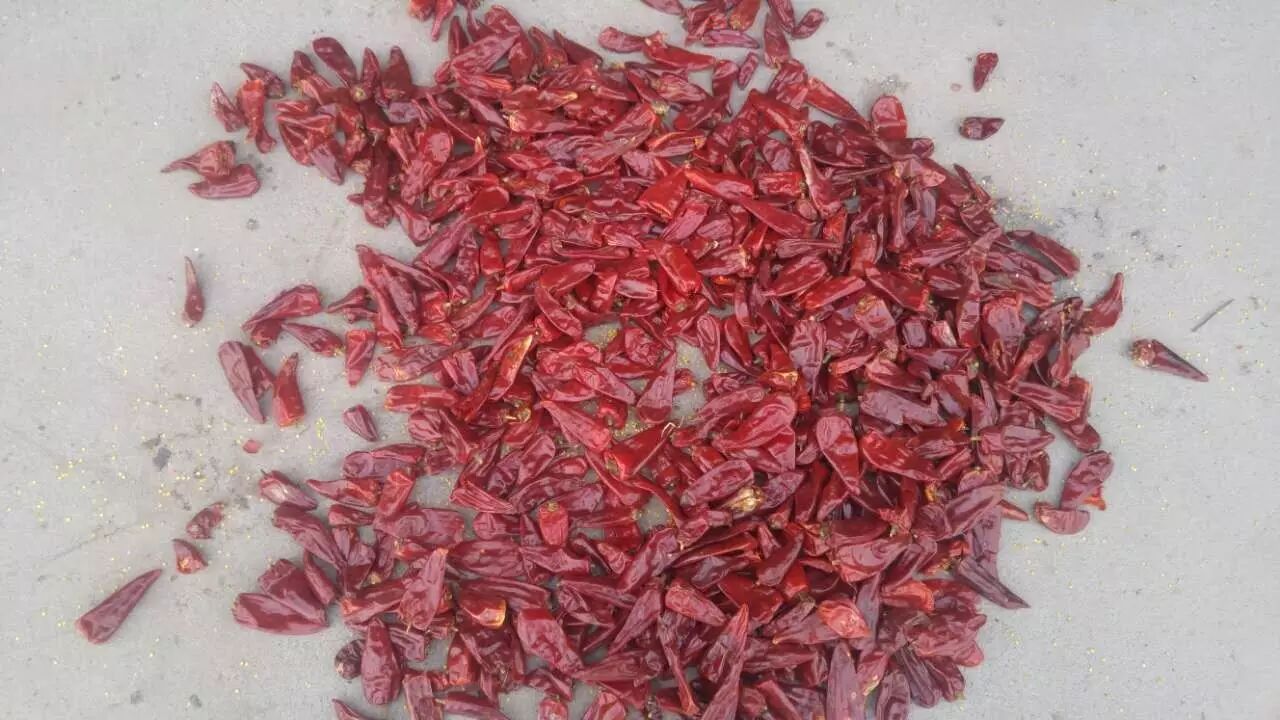 图七:金乡朝天椒,下通货品质,少量花皮椒,椒形扁平,外观似有灰尘,约9-95成干以上,报价10500左右,现场议价成交。