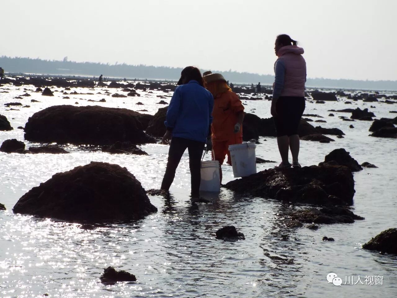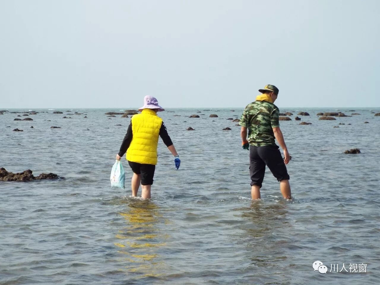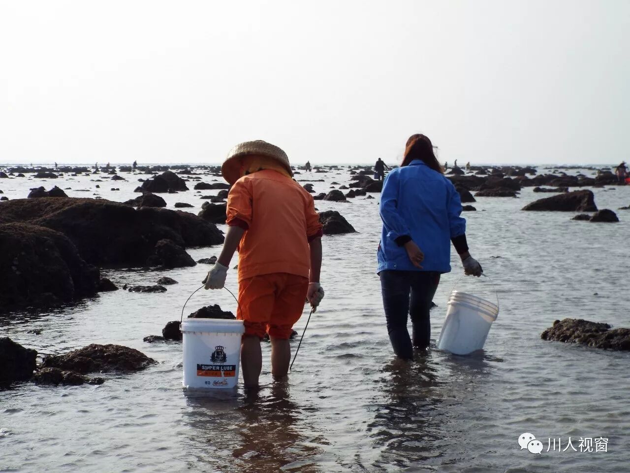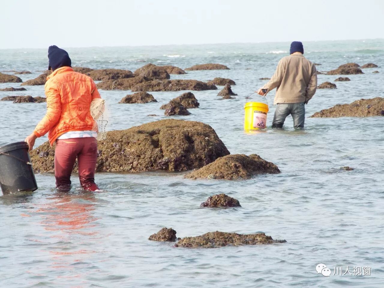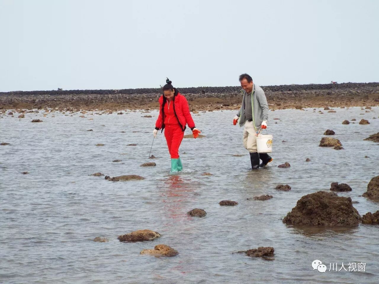 你看!妻赶海来夫提桶,妻唱夫随其乐融融!