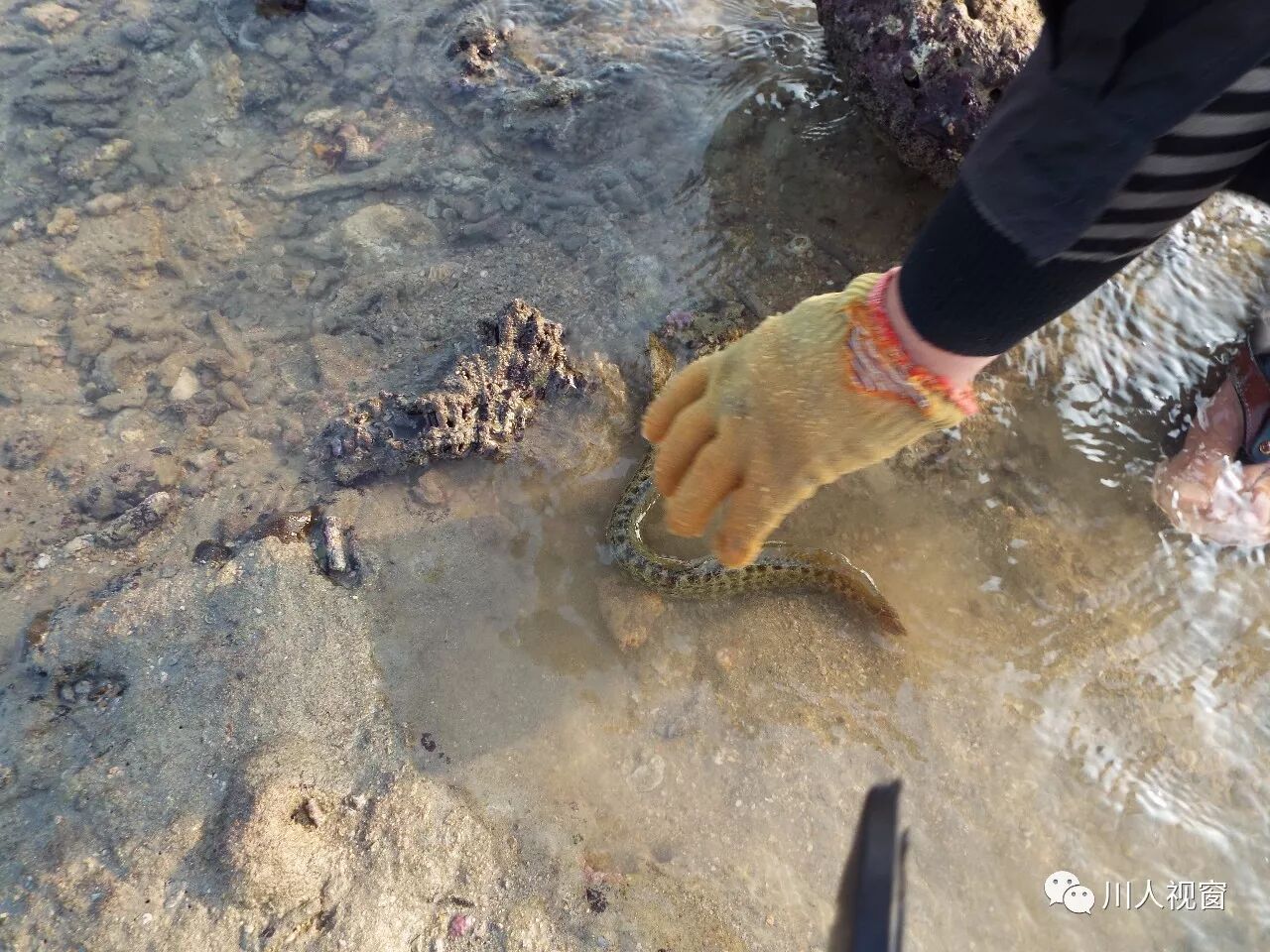 这帅哥抓到一条蛇鳗鱼用绳子绑住,估计在发微信向朋友炫耀吧!