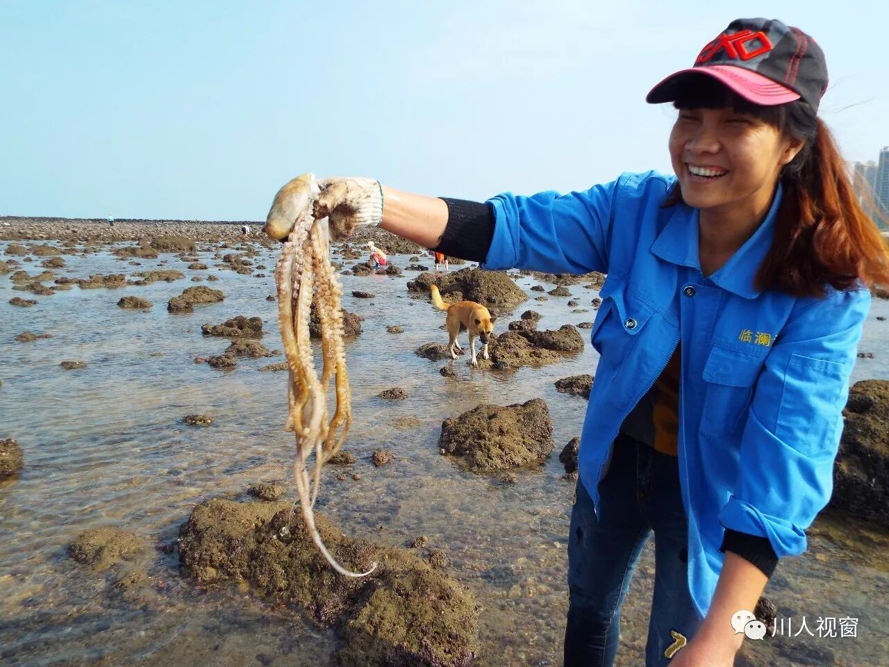 看!这位渔民捡到一只一斤左右的八爪鱼(章鱼)了,笑得多开心呀!