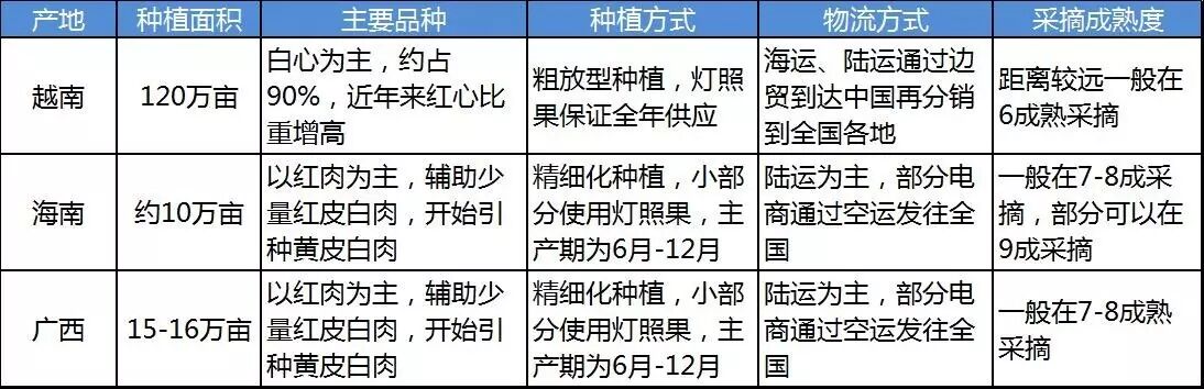 据了解,国产火龙果从5月底、 6月初陆续上市,产新持续到12月份左右。产新地区包括海南、广东、广西、云南、福建、贵州以及四川等省区。进入12月份之后,产地产量极小,亩产几十斤,基本为金都、蜜宝、大红品种。