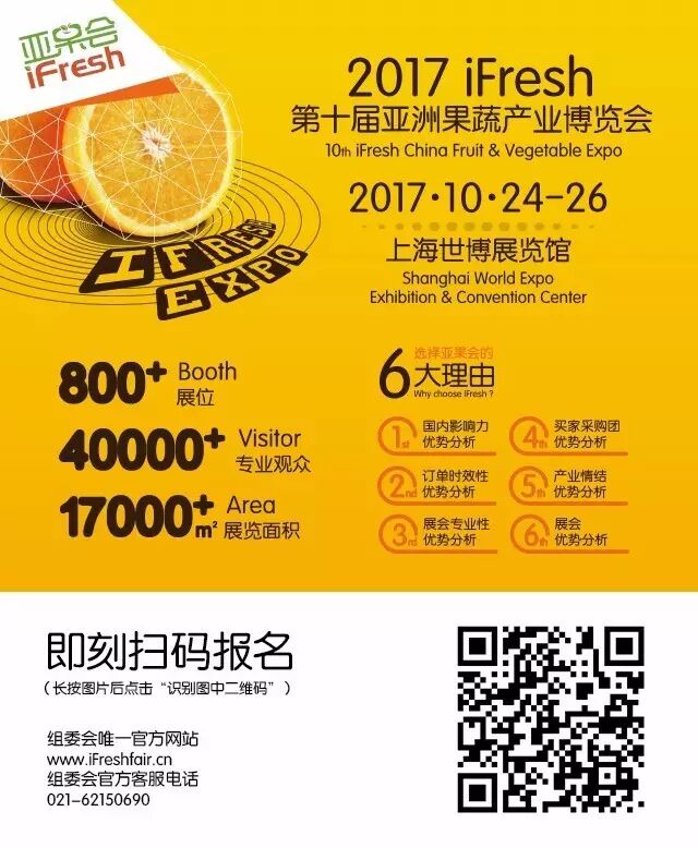 点击阅读原文,即可报名10月24日-26日于上海世博展览馆举办的第十届iFresh亚果会暨亚洲果蔬产业博览会,期待您的参与!