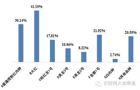 如下图所示,广西被调查的73个“百亩级火龙果园”中,22个园种有“普通授粉红肉种”,30个园种有“大红”,16个园种有“金都1号”,13个园种有“桂红龙1号”,8个园种有“美龙3号”,6个园种有“美龙2号”,2个园种有“白肉种”,有15个园种有其他品种。