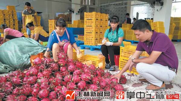 中秋节前,在博白县东平镇新业火龙果种植专业合作社的种植基地,合作社负责人傅俊明正在指挥社员和工人采摘、分拣、包装、发货,一车车精品火龙果从这里发出,销往北上广等大城市。傅俊明是80后,如今水果市场俏销的桂红龙1号火龙果主要育成人之一。他的精品火龙果击败了进口火龙果,成功打进北京、天津、上海、广州等一线城市。最近他被推选为博白火龙果的代言人,对傅俊明来说,这是一种认可,更是乡亲父老对他的殷殷期待。傅俊明高兴地说:“中秋节前后是火龙果最甜的时候,现在每天发往北京的精品火龙果在5万公斤以上,均价为每公斤10元,我们合作社的火龙果在北京很受欢迎,零投诉。”