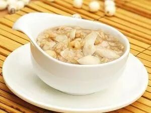 百合50克,湘莲子50克,绿豆200克,粳米50克,白糖500克,陈皮片。百合浸泡备用,莲子浸透去衣,陈皮浸软洗净切丝。莲子加水先煮30分钟,加入绿豆、粳米、陈皮同煲成粥,再加百合煮10分钟,入白糖烧滚调匀即可取食。有消热润肺凉血解毒之效,为夏令之良好食品。