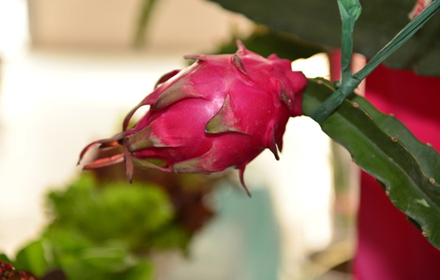 每年结果9-10批次,平均亩产3000-4000斤。从现蕾到开花16-18天,从开花到果实成熟30-38天。果实椭圆形,平均单果重约7两,果肉粉红色,种子黑色。果实鳞片深绿色、平直、较长。果皮红色,肉质茎表面具白色粉状披覆物,果实鳞片成熟时为黄绿色。