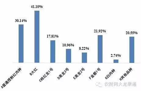 如下图所示,广西被调查的73个“百亩级火龙果园”中,22个园种有“普通授粉红肉种”,30个园种有“大红”,16个园种有“金都1号”,13个园种有“桂红龙1号”,8个园种有“美龙3号”,6个园种有“美龙2号”,2个园种有“白肉种”,有15个园种有其他品种。