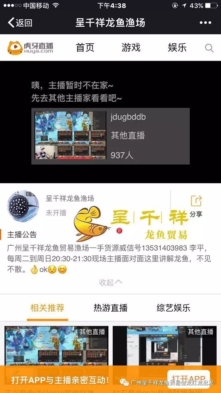 广州呈千祥龙鱼贸易渔场-阿平、请在有Wi-Fi的情况下观看我们朋友圈直播每晚恭候鱼友们零0距离接触壮观渔场场面!周二到周日每晚20:30-21:30我在直播等待着你!请哥们下载:(虎牙直播)注册账号登陆了,复制点击打开:http://www.huya.com/2004922925 就可以互动发话发表问题!如果不会弄请叫年轻一代帮你弄,或者私聊我,十年渔场分享经验!转发你朋友圈让身边的鱼友们一起坐看渔场直播有时活动特价店庆免费送鱼,微信 13531403983 电话15521118388 - 阿平为您服务。