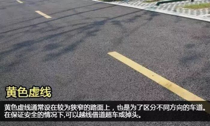 马路中间有1条黄虚线:保证安全的情况下,允许短时压线行驶、压线超车和左转弯。