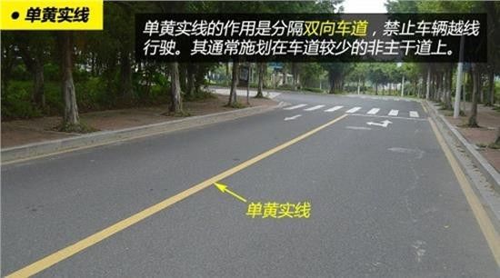 马路中间有1条黄实线:不准压线行驶、压线超车、左转弯。
