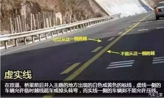 马路中间有1条黄虚线,1条黄虚线:实线的一侧按上面实线的要求,虚线一侧按虚线的要求。