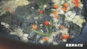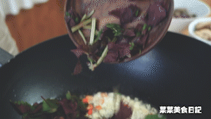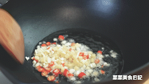 5.锅中留油,下葱姜蒜爆香,放入紫苏叶