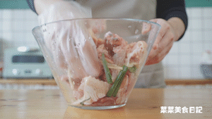 3.下葱段、姜丝、料酒,腌制鸡肉