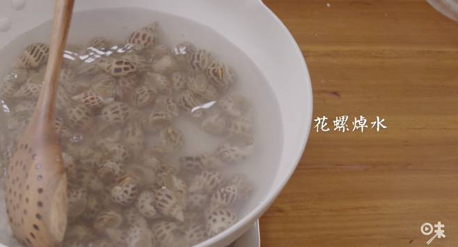 1.锅中倒水烧开,下洗净的花螺焯水后过冷水 ↑;