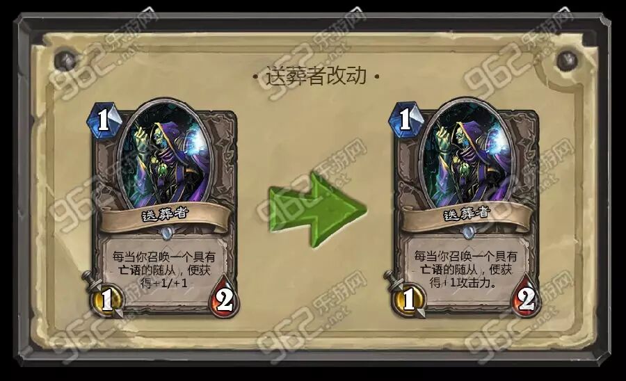 我们首先从送葬来说,送葬一出,谁与争锋的局面,不解送葬,必败无疑,送葬者1费1/2身材:召唤一个亡语随从使其+1/+1,送葬确实太BUG了,送葬第一回合解不掉就基本输了,带送葬的猎人卡组不仅在一费随从数量上远多于其他卡组,而且在一二费的亡语随从 上也是很多的(马云、结网蛛、发条、需求、鬼灵、科学家、),这就大大降低了猎人起手卡手的难度。标准起手:把尸体拿过来-我感觉很难受-我会证明的-对面我选择死亡 。