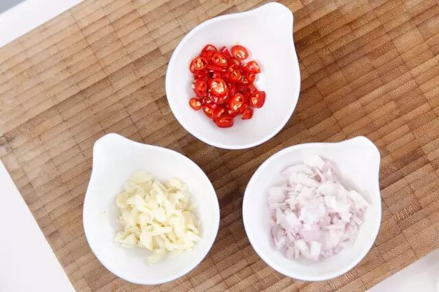 2、干葱切幼粒;蒜头切成蓉;朝天椒切粒