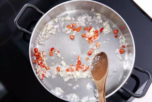 5、用中火烧热一个浅锅,加少许油,炒香干葱、蒜蓉及指天椒。