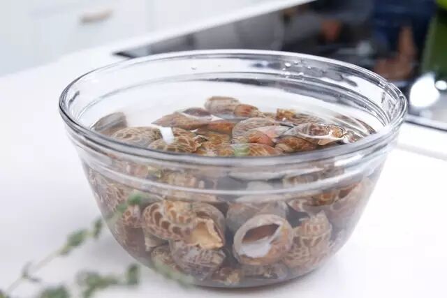 1、花螺洗净后浸在盐水30分钟,沥干备用