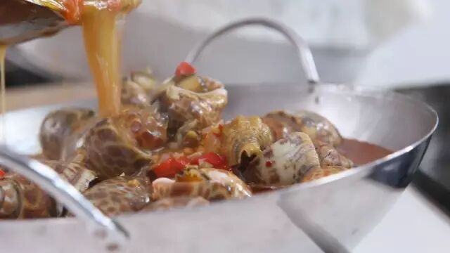 8、加入豆瓣酱、生抽及砂糖炒匀,让花螺平均沾满酱汁