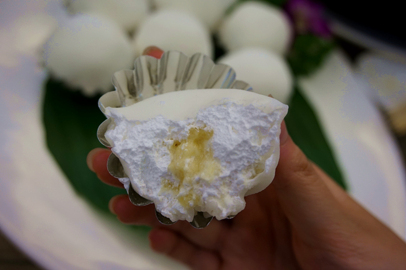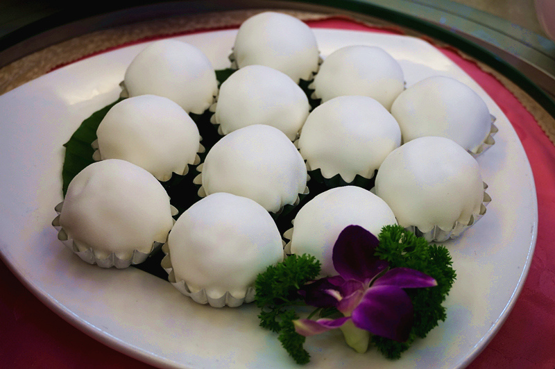 饭后甜品係“冰皮雪榴莲”。中间夹心係榴莲肉,一啖咬开就闻到香味啦!
